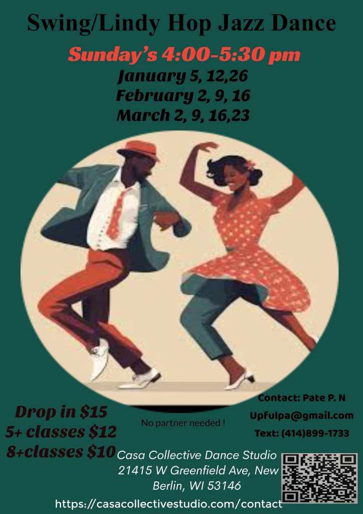Starting on the first Sunday in January 2025, dance instructor Paté (Patrice) Nassalang will be teaching 90-minute beginner/intermediate swing dance lessons almost every Sunday at Casa Collective in New Berlin. Both 6-count (“East Coast Swing”) and Lindy Hop are being taught. No experience or partner needed. Details below.
