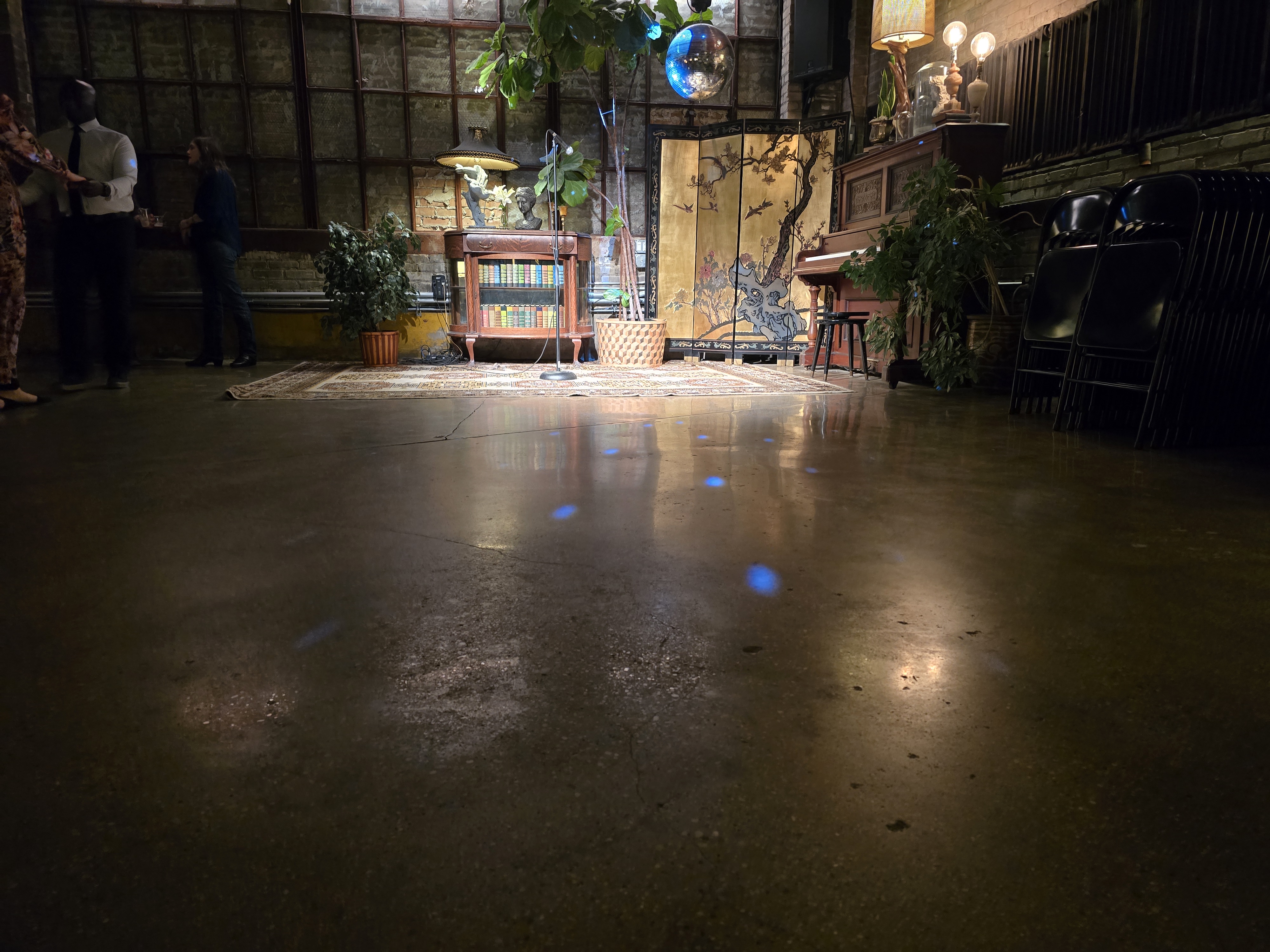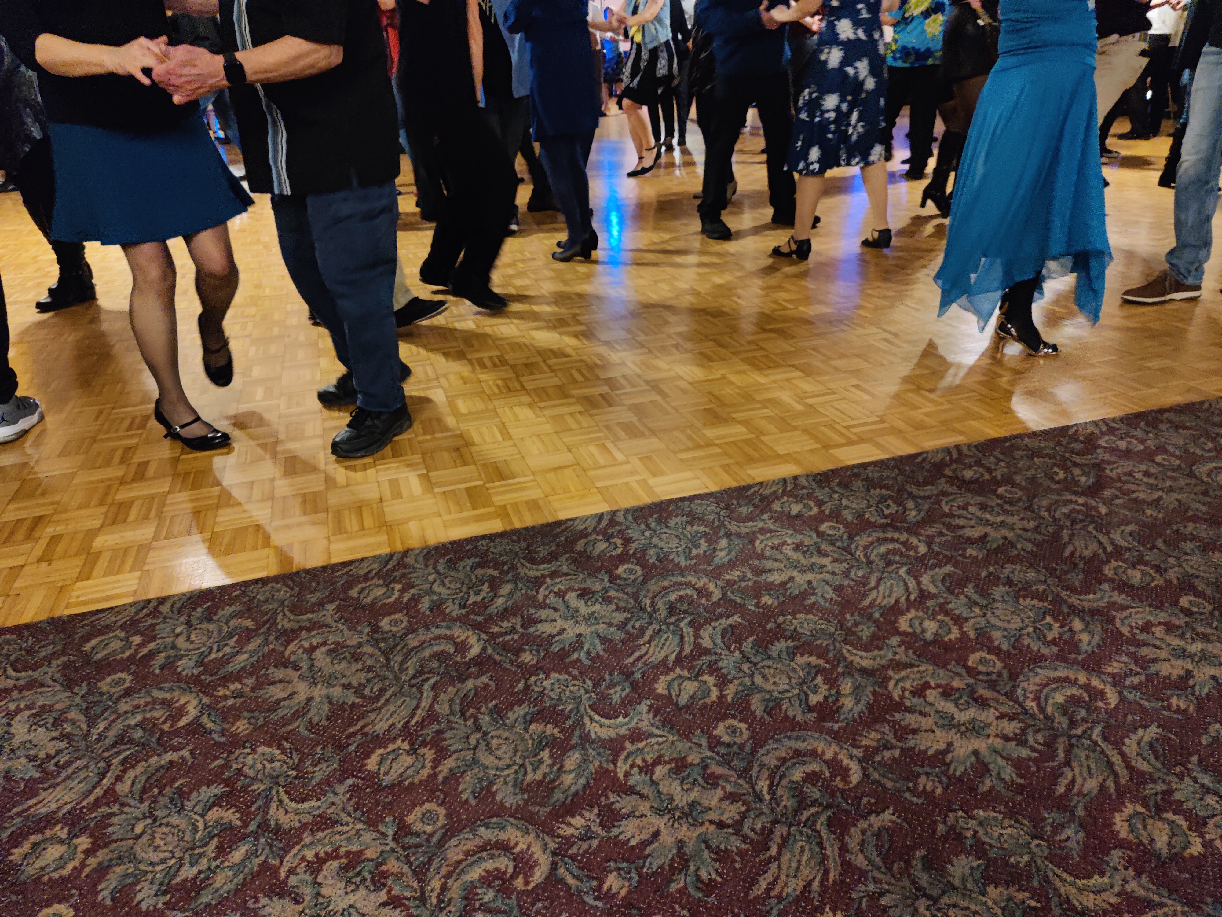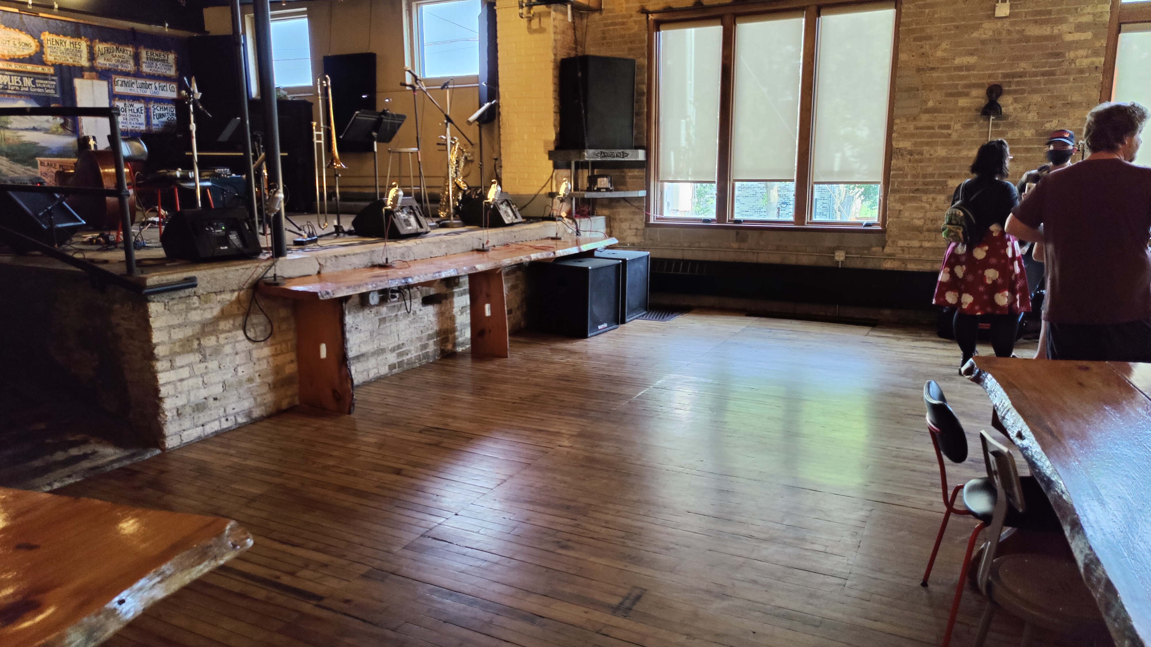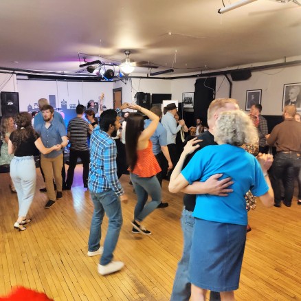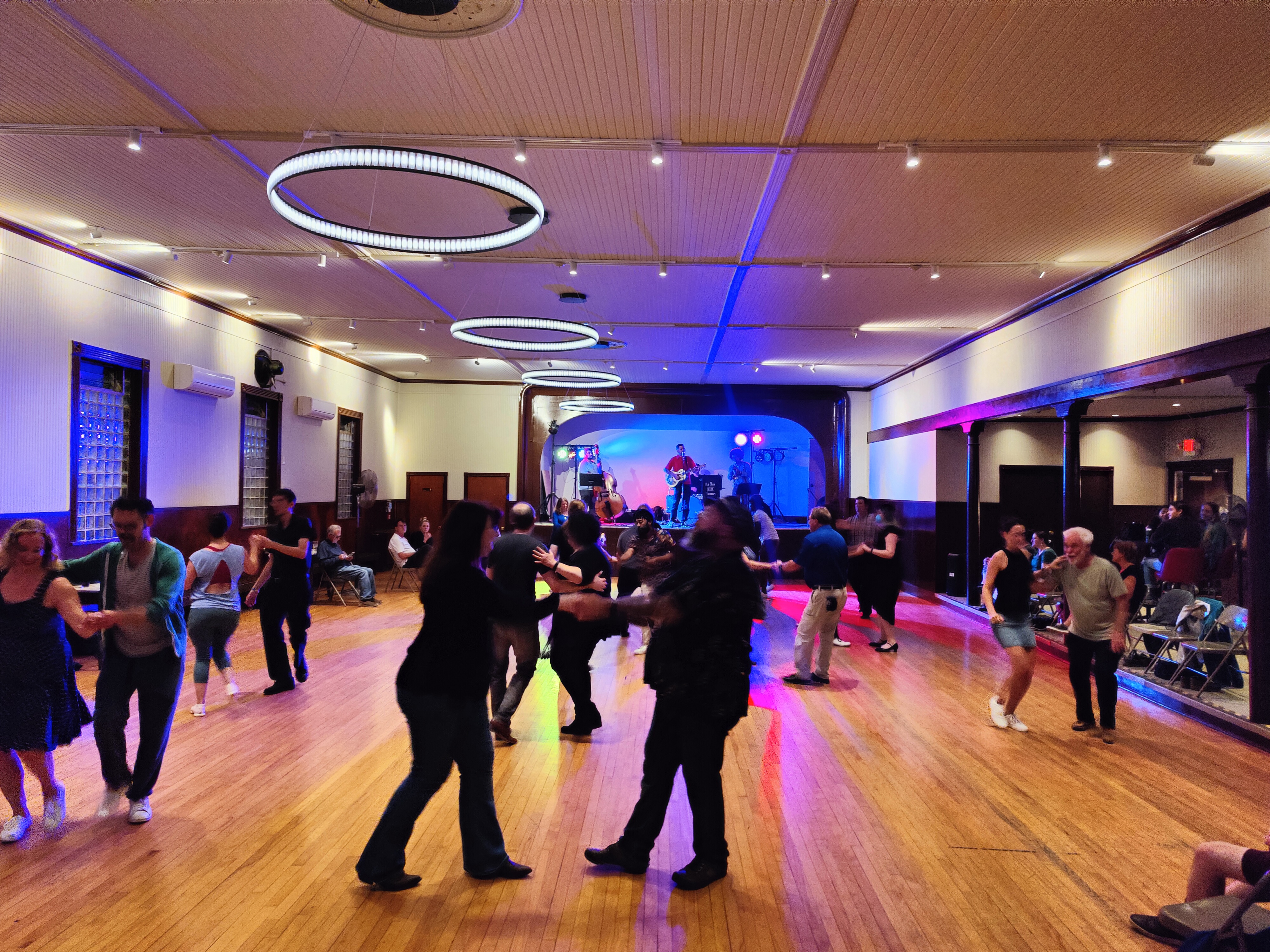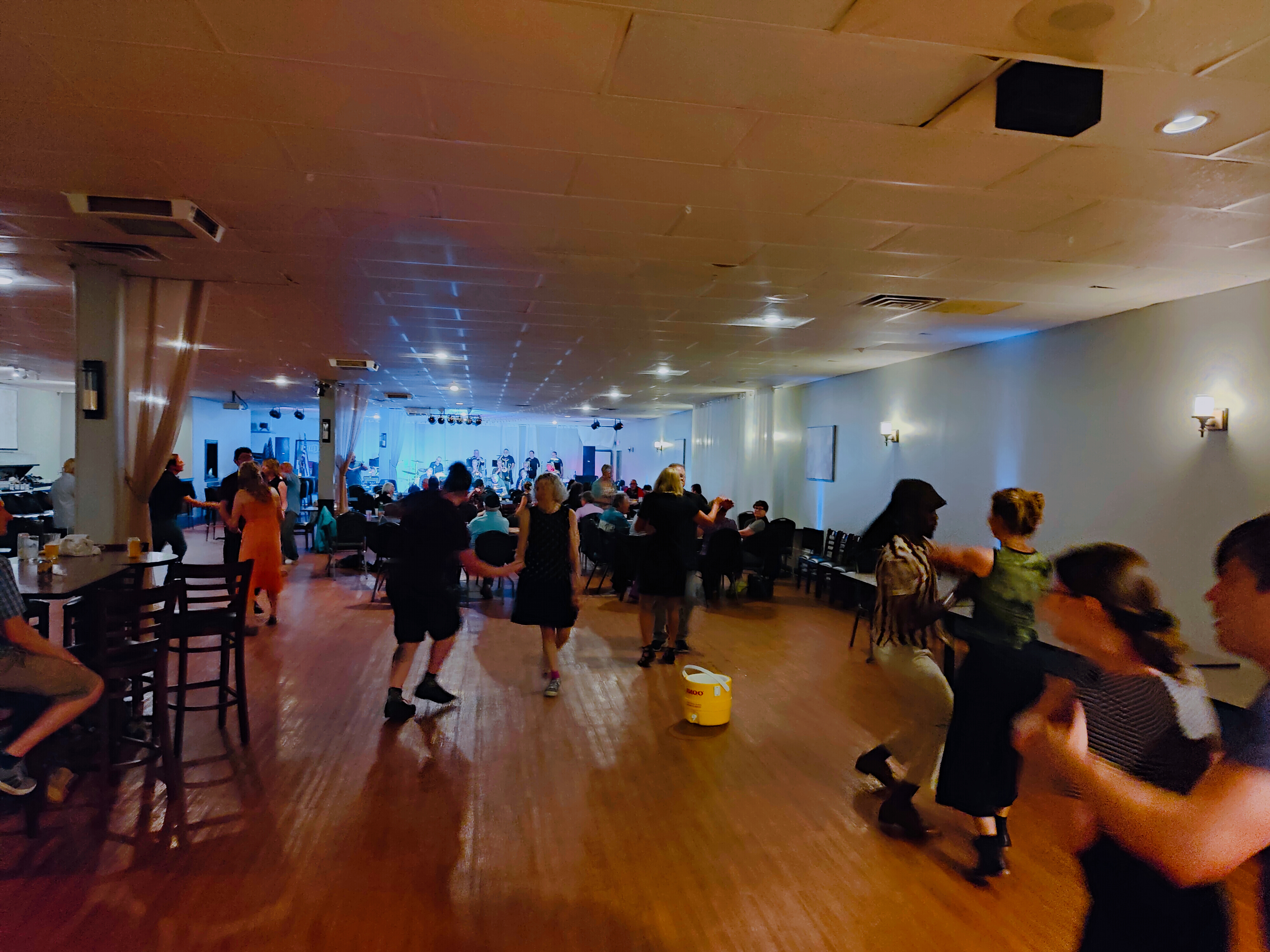 The venue features a wood floor that is nearly always well kept. This venue is rented to parties and weddings and parts of the floor can be sticky. So, consider bringing two pairs of shoes: one with suede and one with leather soles.