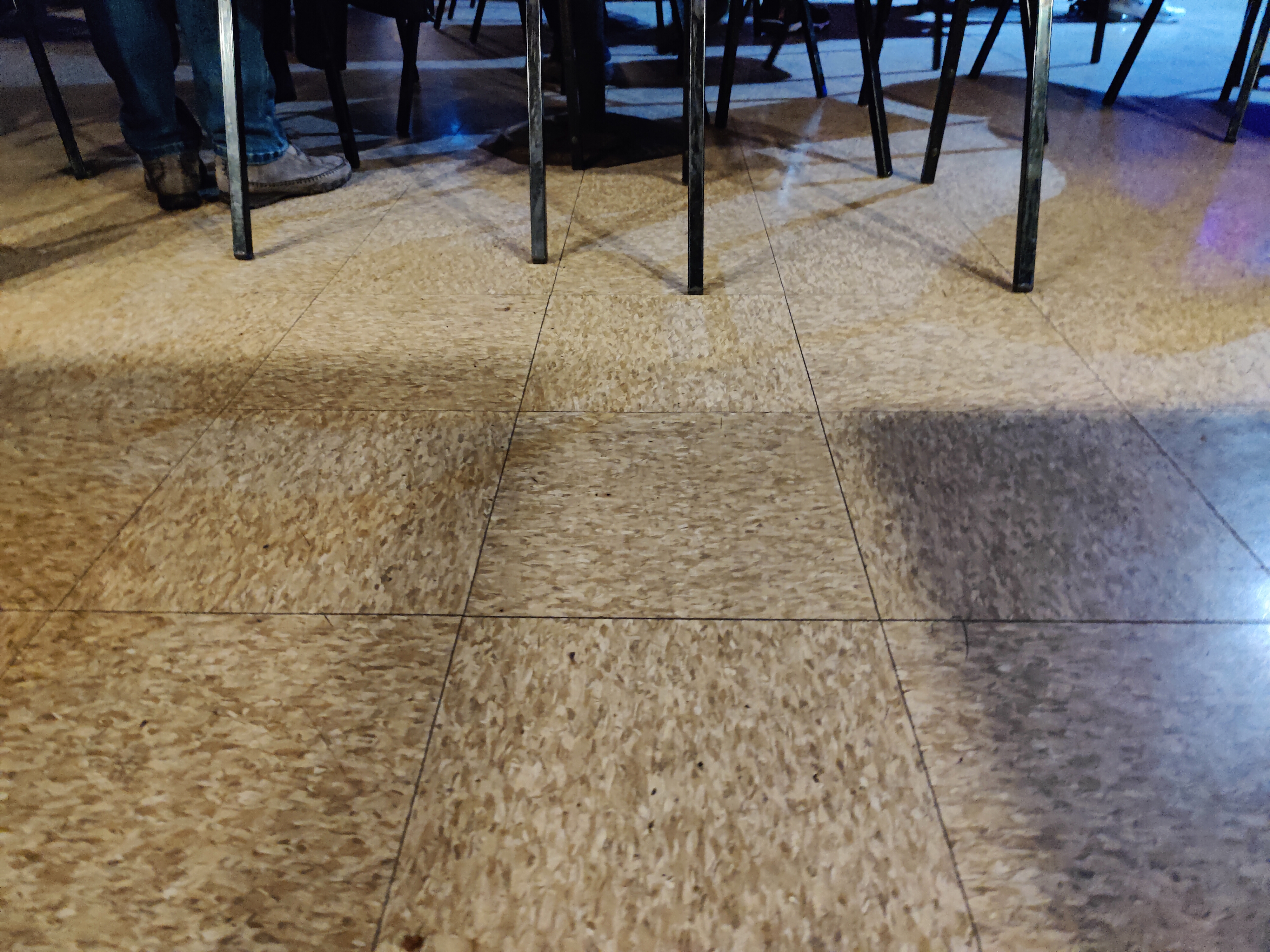 There is about 150 square feet of dance space in front of the band stage. Four swing dance couples or eight blues dance couples can comfortably navigate the floor. The finish is old floor tile with a few missing chunks. The condition of the floor tile is adequate. The tile is over wood subfloor and there is some give, which is preferred over tile installed on concrete.
